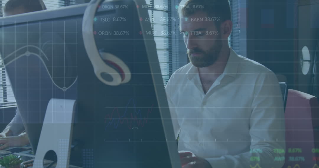 Image depicts a man deeply focused on analyzing stock market graphs on a computer monitor superimposed with data. This concise execution can be used to depict financial reviews, investment disciplines, data analysis themes or articles related to statistical implications concerning economic shifts. Perfect for professional and financial content in blogs, financial reports, or business web applications.