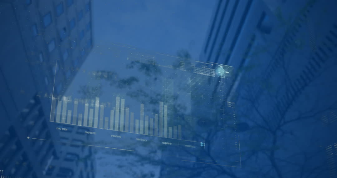 Digitally generated interface showing data analytics visualization with overlay of urban landscape signifies modern business operations. Suitable for use in websites or presentations about business tech trends, cloud services, or data management, emphasizing the integration of digital data processes with everyday life and infrastructures.