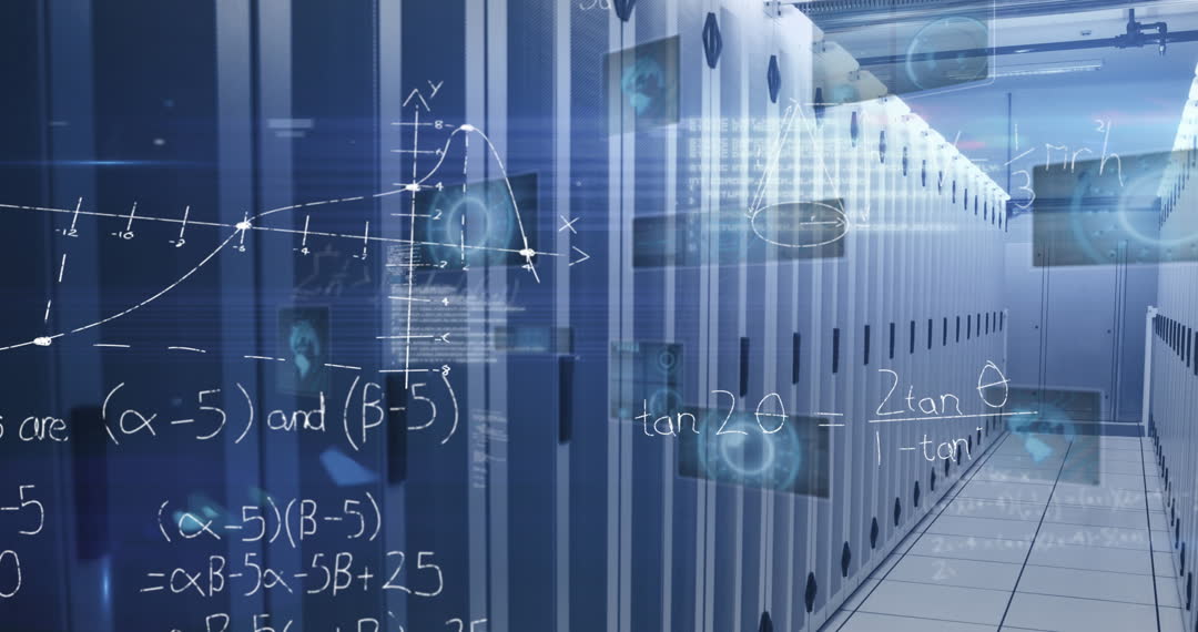 Server room combined with digital interface suggests modern technology integration and data analytics. Mathematical equations overlaid represent advanced computing processes. Ideal for illustrating high-tech environments, digital innovation, cloud computing themes, or informational technology topics.