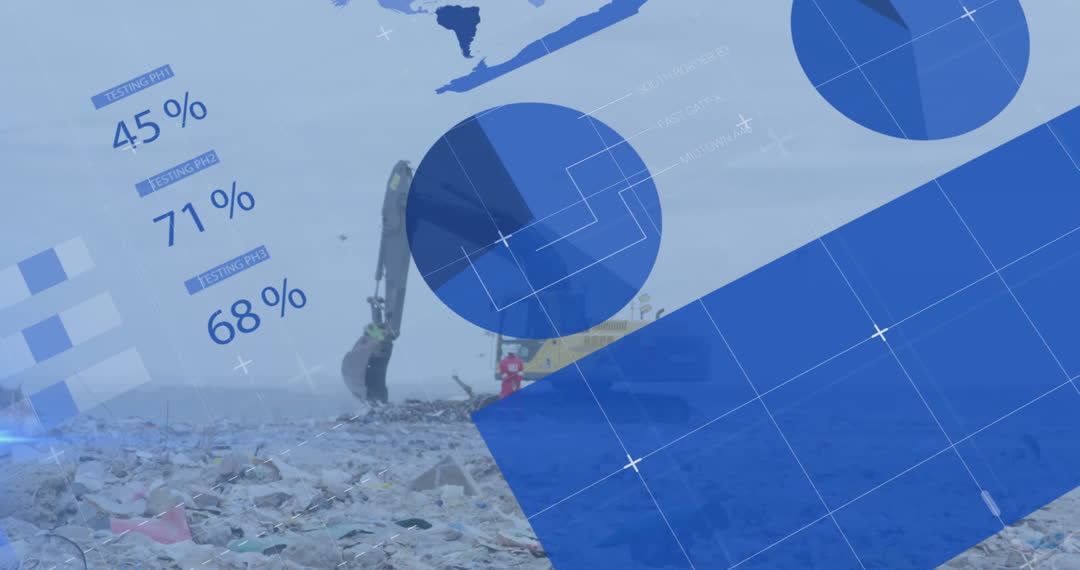 Overlay of blue-toned data visualizations depict statistics over a scene of landfill, highlighting the environmental issue of waste management. Ideal for topics on sustainability, statistics in technology, or ecological challenges. Perfect for educational materials, sustainability reports, or environmental campaigns.