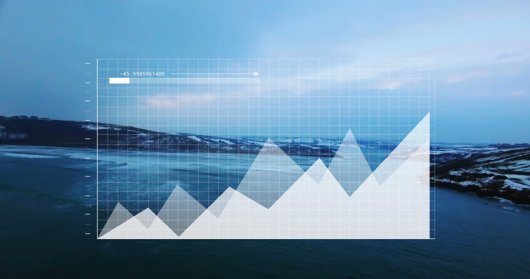 This visual combines data analysis graphics with an outdoor aerial backdrop at dusk, creating a unique blend of natural scenery and technological overlays. Useful for illustrating finance and data analysis results in a creative way. Ideal for presentations or articles involving data visualization, technology in nature, or financial forecasting.