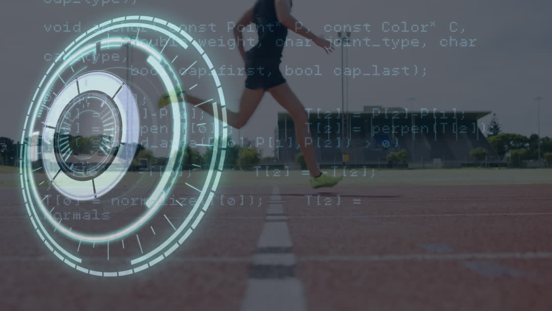 Concept of advanced sports training with technology overlay showing digital data analytics. Useful for illustrating modern innovations in athletic performance and the impact of technology on sports science.