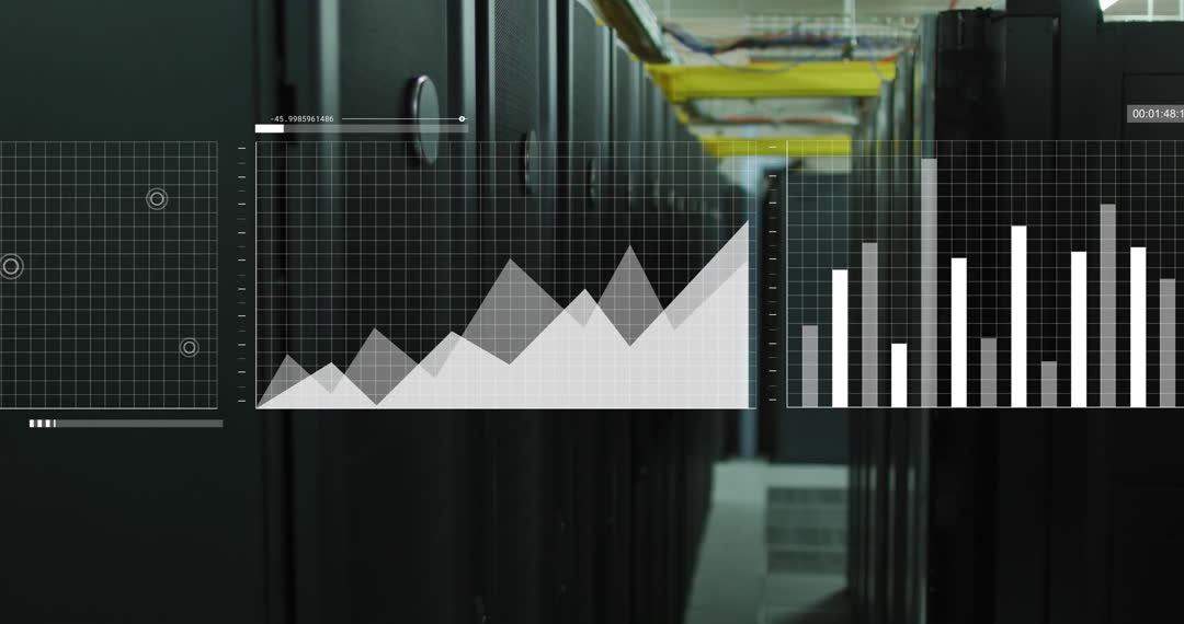 Graphical interface displays statistical data charts in server room indicating real-time data processing and network analytics. Suitable for illustrating concepts of big data management, server efficiency, cybersecurity, and innovations in information technology.