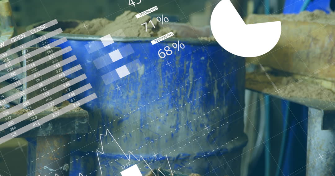 Imagery shows integration of advanced data analytics within an industrial construction site, symbolizing modern operations. Suitable for illustrating how digital transformation impacts traditional industries. Can be used for business reports, articles on technology in construction, or presentations on data-driven decision-making in industrial environments.