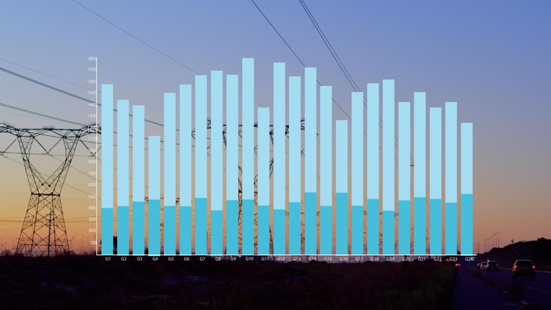 The video features a digital overlay of a data bar chart against a sunset backdrop with power lines. It symbolizes the fusion of technology and global energy infrastructure. Perfect for use in presentations on data analysis, renewable energy development, technology advancements in utilities, or global networking strategies.