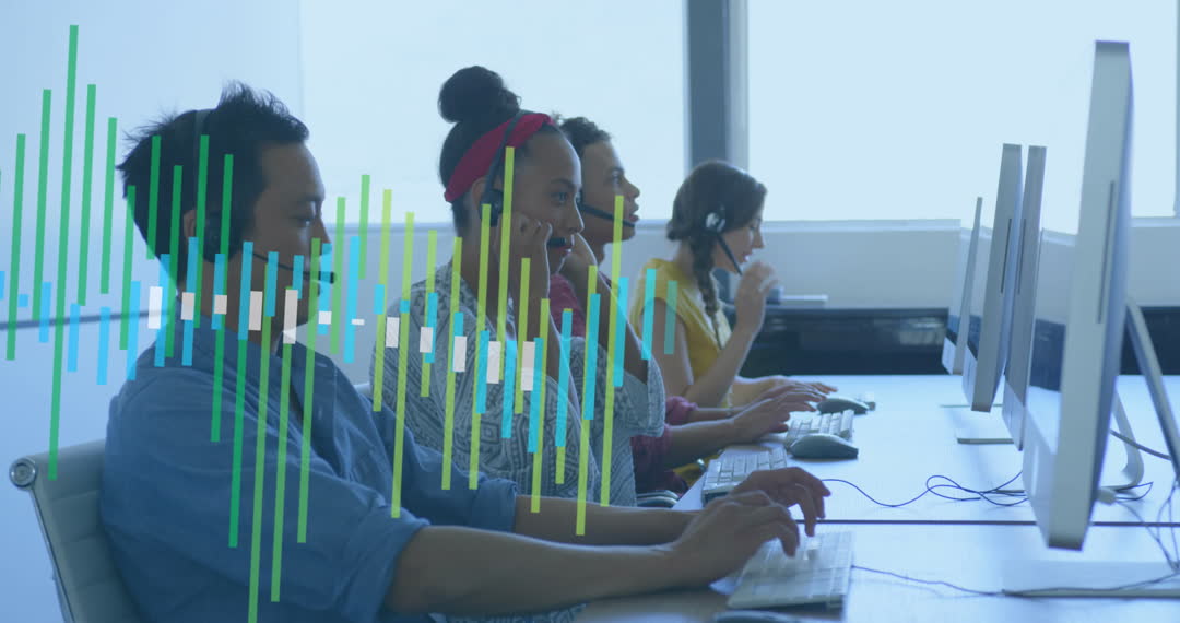 Team of diverse colleagues collaborating while working with statistical data in modern office. Visualization overlays suggest emphasis on data-driven practices in a collaborative environment. Useful for illustrating themes related to team dynamics, data analytics, business technology, and workplace collaboration in marketing materials, presentations, or website content.