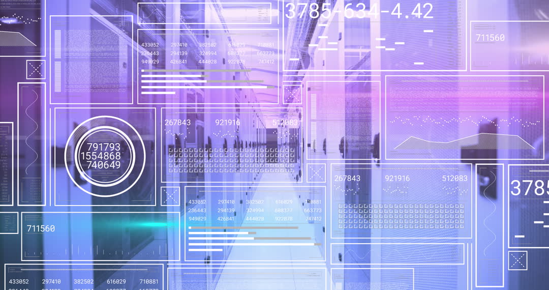 Overlay of digital analytics and statistics shown over a server room, representing modern technological networks and data processing. Useful for illustrating articles on data management, IT security, tech development, or advancements in information technology.