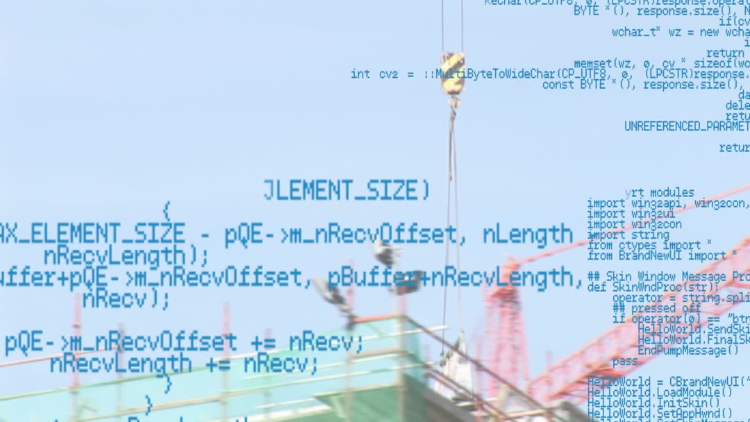 Animated overlay of software code with construction site indicates technological advancement in architecture and global construction industry enhancement through data integration. Useful for illustrations in tech-architecture collaborations, engineering innovation representations, and business presentations on modernization.