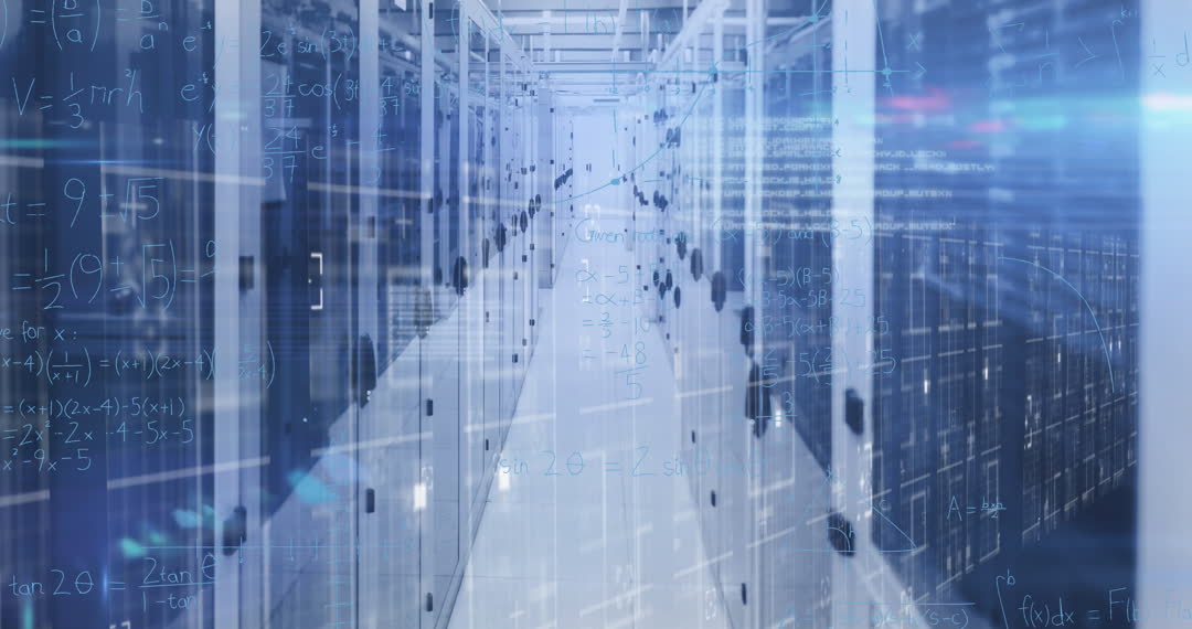 Visual merges a high-tech server room with floating mathematical equations, symbolizing cutting-edge technology and advanced computing. Useful for illustrating concepts related to AI, machine learning, data processing, and network infrastructure. Ideal for technology-focused presentations, websites, and educational materials explaining modern data storage and processing capabilities.