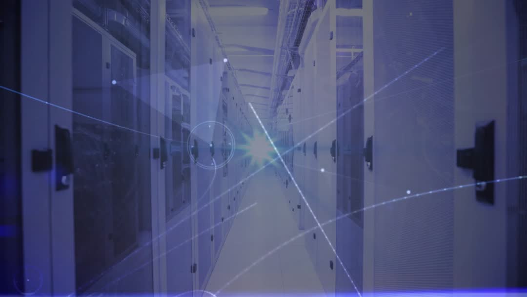 Video showing long corridor of server racks with cool blue grading, lens flare and animated HUD lines visualizing network status and data streams. Mood conveying secure, futuristic infrastructure and high-speed connectivity for modern IT environments. Use for technology corporate promos, cybersecurity presentations, cloud computing explainers, IT infrastructure training videos, broadcast openers, website hero backgrounds and social media ads. Recommend overlaying text, lower thirds, real-time statistics panels or voiceover for product demos and data security narratives. Clip working well as looping background or transition element in motion graphics packages and broadcast packages. Color palette supporting white or neon typography and minimal design. Source clip suitable for HD and 4K projects depending on original capture.