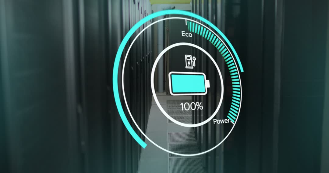 - Data center power HUD overlay displaying 100% battery, eco mode and power management