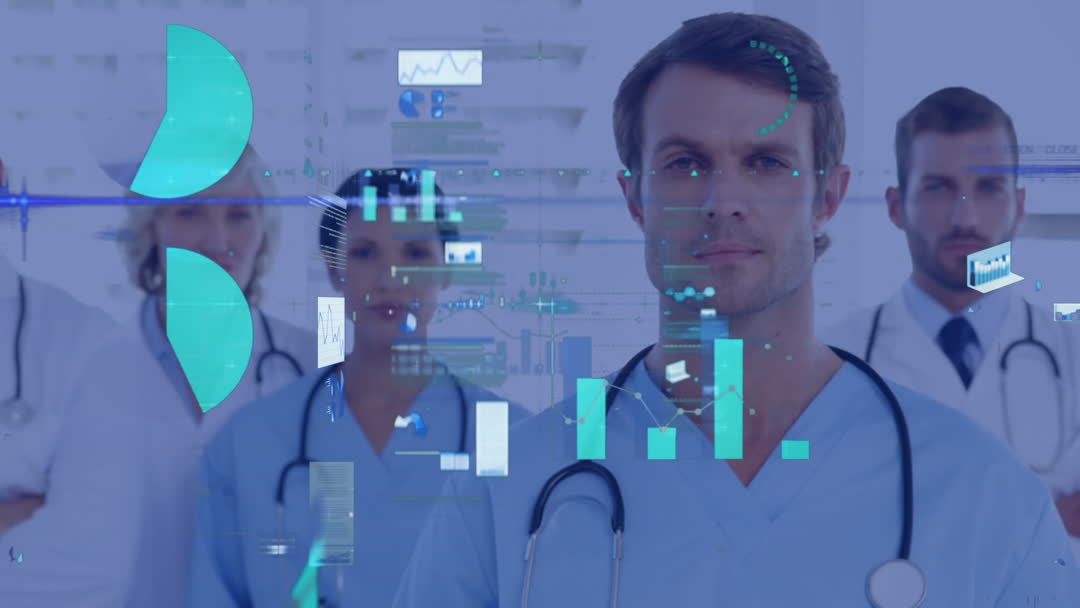 Medical professionals stand together, integrated with digital data processing graphics. This video represents the fusion of technology and healthcare, highlighting how modern medical teams utilize data analytics to improve patient care. Ideal for presentations on medical technology advancements, healthcare innovation, and the role of data in health services.