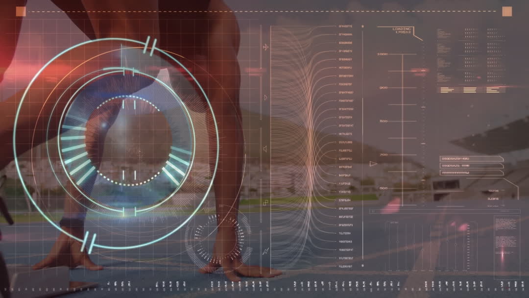 Dynamic graphic displaying a century mix runner with superimposed data displays futuristic analyst for sport technology. This visual perfectly fits technology events, sports analytics presentations or marketing of cutting-edge sport wear and gadgets.
