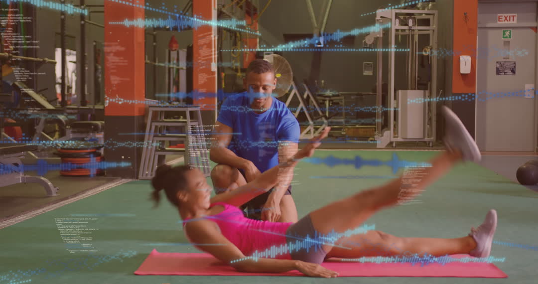 A woman wearing fitness attire is conducting exercises on a mat while guided by her male trainer. Digital data and analytical graphics overlay the scene, illustrating technology's role in fitness tracking. This video is ideal for use in promotions of wearable technology, fitness apps, or modern gym equipment, emphasizing a high-tech approach to health and workout optimization.