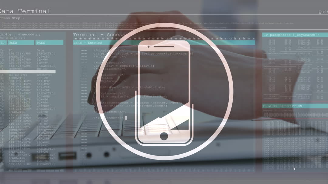 Illustrates concept of data encryption showing hands typing with overlay of coding interface and mobile icon. Useful for articles, presentations, or software discussing cyber security, coding, digital privacy, or modern technology practices.
