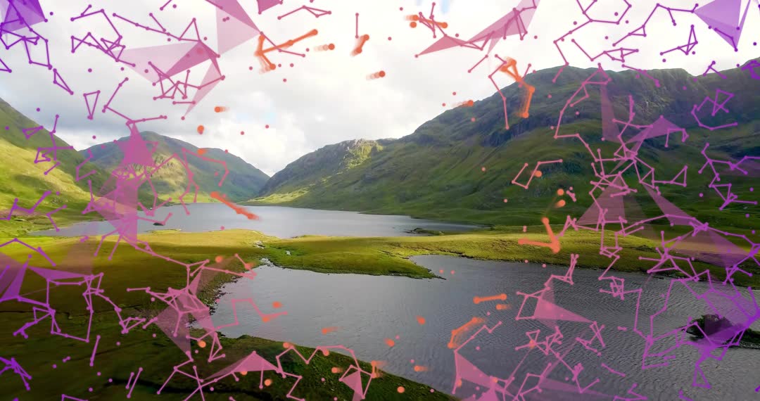 Geometric and futuristic pink overlay intersects with aerial footage of a serene valley, symbolizing the fusion of nature and technology. Suitable for illustrating concepts of data communication, bridging high-tech elements with natural environments. Ideal for presentations, tech promotions, and creative projects depicting advancement alongside nature.