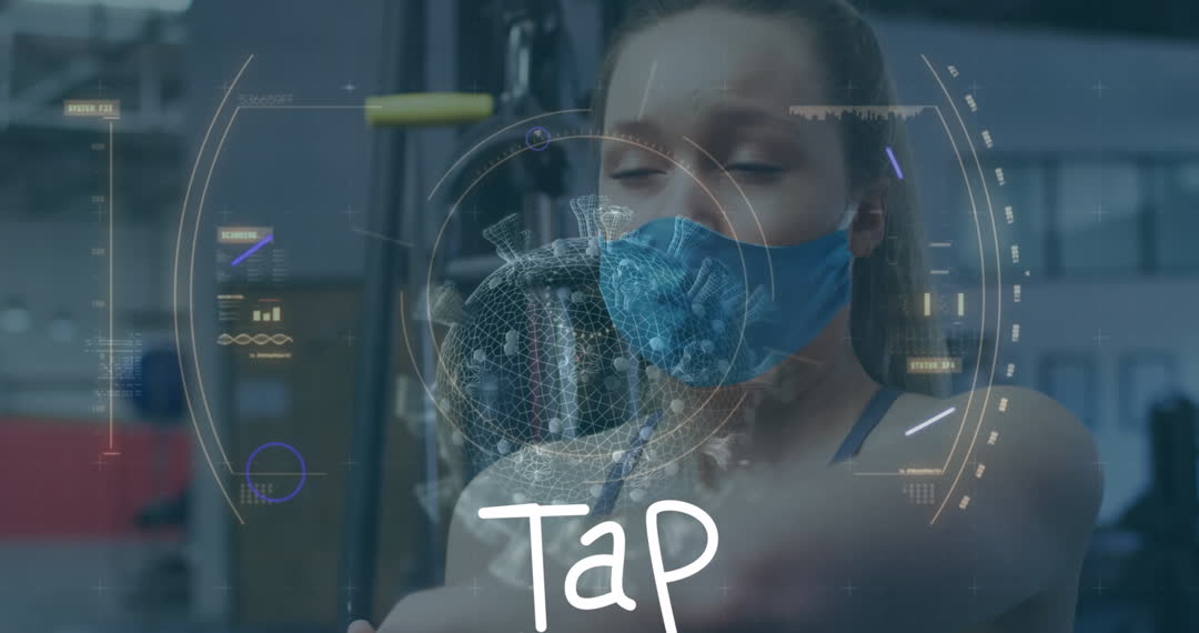 Data Interface over Masked Woman in Futuristic Exercise Setting Video
