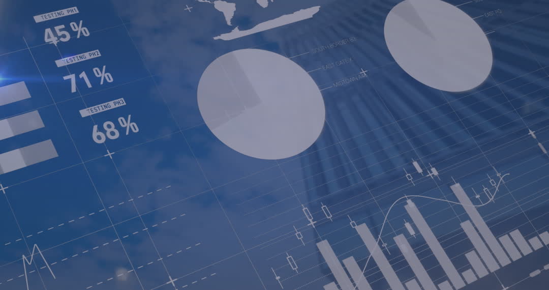 Image illustrates an overlay of a digital data interface with graphics and charts projected against a modern skyscraper backdrop under a cloudy sky. This visual representation is ideal for use in business reports, presentations on global market analysis, progress tracking in corporate growth, technology integration, or architectural innovation-themed publications.