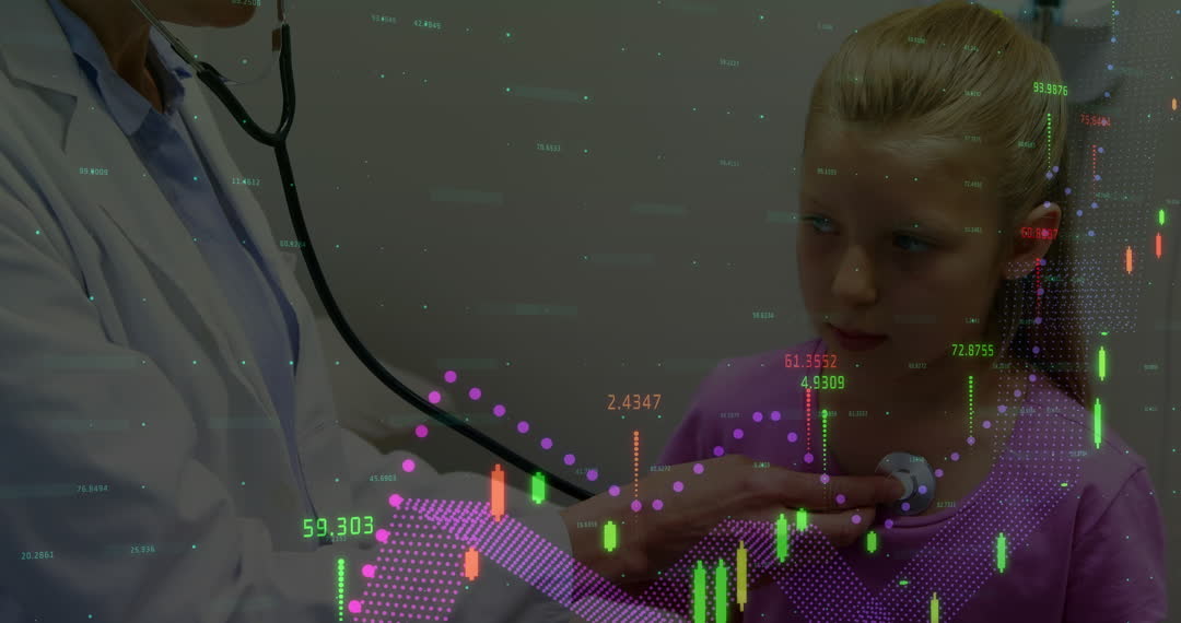 Doctor using stethoscope on girl's chest while digital data overlays imply real-time health analysis. Ideal for illustrating technology in healthcare, digital diagnostics, medical data trends analysis, and child health care scenarios.
