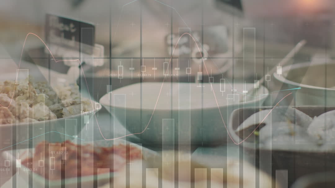 Various bowls filled with food items blend with an overlay of financial data graphs, suggesting connections between data analysis and the culinary industry. This creative visualization could illustrate market research in food sectors, technological advancements, or represent trends in the global food market. Ideal for articles or presentations related to data science in the food industry.