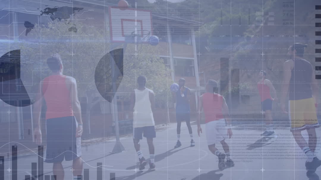 Athletic youths engaged in a basketball game on an outdoor court with animated data, graphics and statistics layered visually above them, illustrating a blend of sports and technology. Useful for illustrating the application of data analytics in sports, sports innovation strategies, or in content focusing on the impact of technology on athletics.