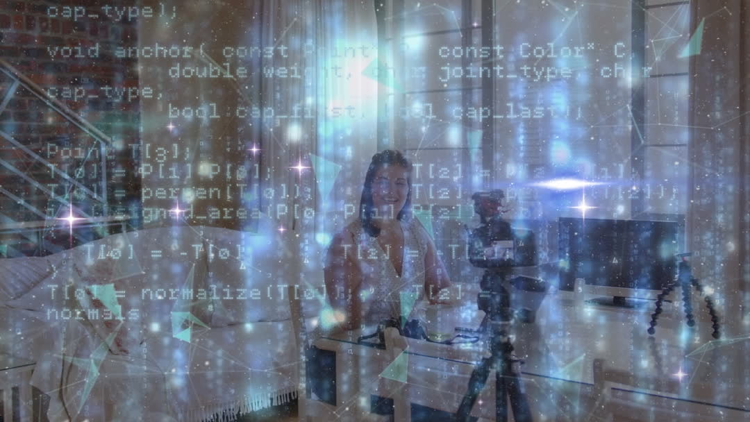 This visualization features data code overlaying a woman recording a vlog for social media. It highlights the intersection of lifestyle content creation and digital technology, suitable for themes like data in social media, technological influence on content creation, and the modern digital lifestyle. Ideal for illustrating online content production and digital interactions.