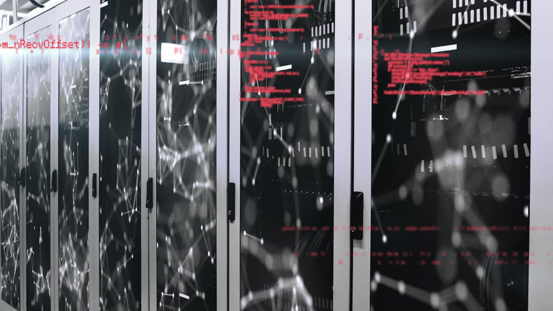 This visual showcases an abstract animation of data processing activities taking place over a row of sleek servers. Bright red numerical sequences and web-like structures artfully layer atop server racks, hinting at network connectivity and technology integration. Ideal for illustrating concepts in digital networks, cyberspace endeavors, or IT monitoring systems. Versatile use in presentations, workshops, and publications relating to computer science innovations or data handling procedures.