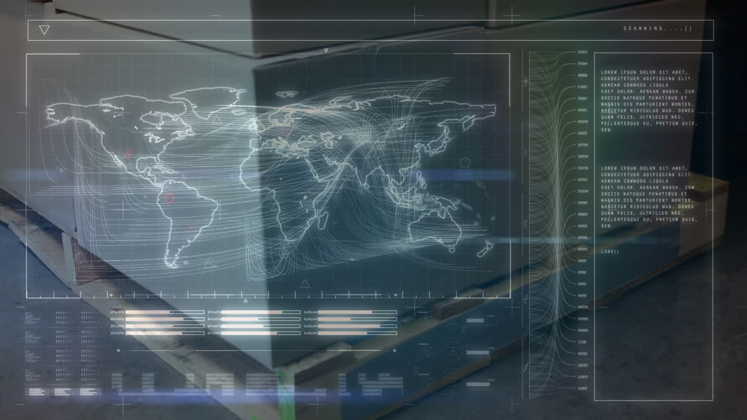 Animated visualization shows complex data processing and global logistics networks superimposed over packages in a warehouse. Useful for demonstrating modern technologies in supply chain management, global shipping, and delivery services. Ideal for presentations and marketing materials focused on logistical efficiencies and technology solutions.