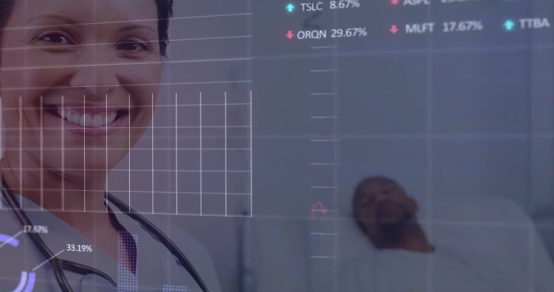Conceptual video depicting a fusion of digital technology and healthcare, showing a female doctor smiling with graphical data overlays in a hospital setting. Well-suited for content on advancements in healthcare technology, medical data analysis, and the incorporation of digital solutions in hospital environments.
