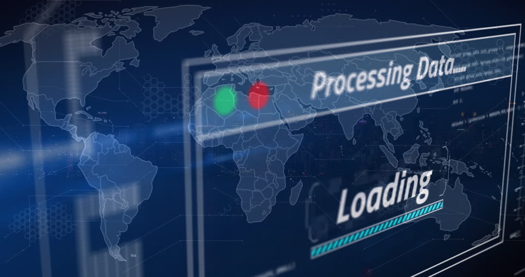 Visual depicting data processing and loading overlaid on world map, ideal for illustrating concepts in global technology, cloud computing services, digital transformation, and artificial intelligence. Useful in presentations, digital marketing for tech companies, and educational content about global data systems.