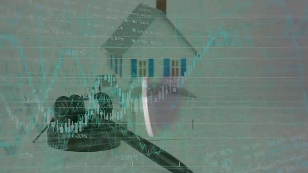A blend of a house video and data visualization, ideal for themes on housing market analysis or financial investment blogs. Useful for illustrating the intersection of real estate and technology-driven finance strategies.