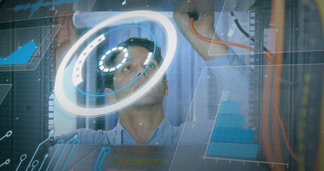 An engineer works intently with a futuristic interface overlay, depicting complex data processing and statistical graphs. The video reflects themes of innovation, digital transformation, and advanced technology. Suitable for use in articles about modern technological advancements, IT industries, or data analysis techniques.