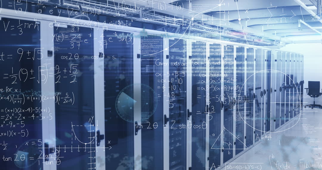 A dynamic blend of mathematical equations and a high-tech server room symbolizes the interplay of complex data algorithms and digital infrastructure. Useful for illustrating concepts in IT development, data analysis, network security, and technological advancements in presentations, web content, or articles.