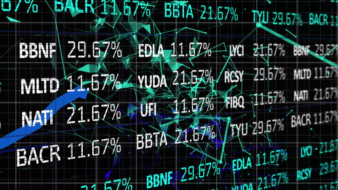 This visual represents a digital display with fast-moving data and numbers, suggesting technology and data analysis in a modern context. It is suitable for illustrating concepts in business, finance, cyber security, technology advancements, or data science applications. Use this for presentations or content that emphasizes technological themes or financial markets.