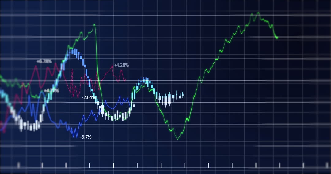 Visualization of dynamic line graphs on a dark grid represents data analysis and trending concepts. Useful for illustrating financial growth, market researchers, or presentations in data sciences. Effective in technology themes and digital analytics discussion.