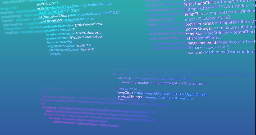 Visual features code lines and digital data overlay on a blue to purple gradient background. Suitable for illustrating concepts related to digital information, software development, IT processes, or technology in presentations, articles, or website backgrounds.