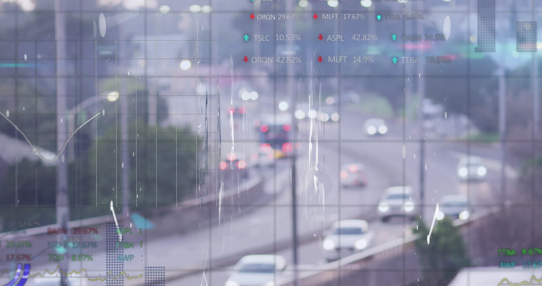 This visual captures the concept of data processing overlaid on an urban landscape, with blurred traffic on a highway. It represents global business operations, financial markets, and technological analytics. Useful for illustrating corporate and economic concepts in business presentations, websites, or advertisements focused on modern finance and technology.