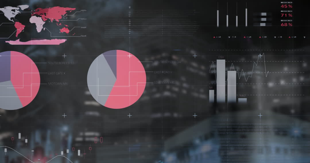 This visual shows animated data displays overlaying a cityscape at night, symbolizing the intersection of technology and urban life. It includes various elements like pie charts, bar graphs, and a world map, conveying concepts of global business and analytics. Ideal for illustrating themes of digital transformation, data-driven strategy, and technological advancements in an urban environment. Suitable for business presentations, promotional material for tech companies, or educational content on digital transformation.