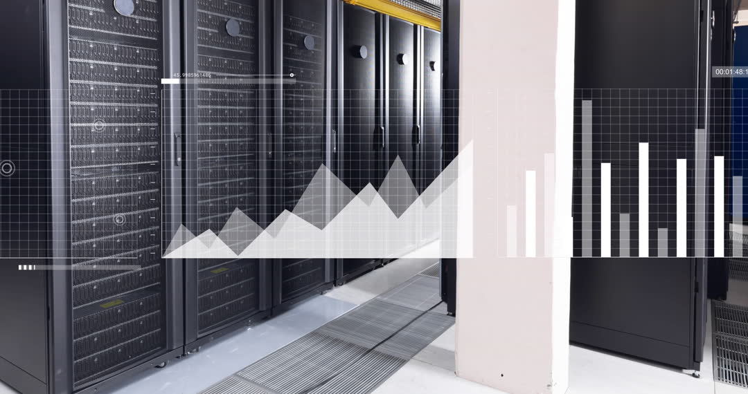 Shows digital animation of data processing with a background of computer server equipment. Perfect for illustrating concepts in data analysis, information technology, and business data management, making it suitable for use in presentations on tech innovations, data monitoring, or IT infrastructure.