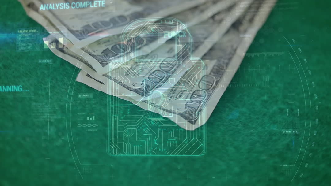 The illustration features US dollar banknotes overlaid with futuristic digital graphics such as data and circuit elements symbolizing the integration of technology with finance. This visual is ideal for illustrating articles or concepts related to digital banking, cybersecurity, global business transactions, or financial technology. The combination of traditional currency and modern data design makes it suitable for educational materials on the evolution of currency. It attracts attention in presentations publicizing fintech services or discussions about modernizing financial systems.