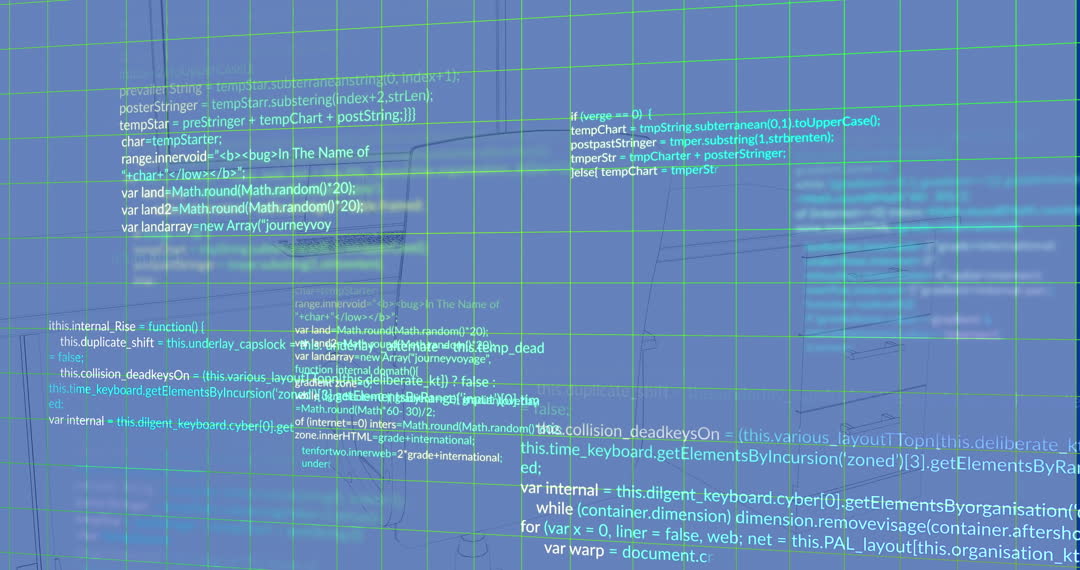 This illustration shows a digital sequence of coding and data highlighted against a blueprint of an office desk, depicted over a blue background with grid lines. Ideal for use in presentations that focus on themes of data technology, modern business solutions, or future trends in computer interface design. Suitable for technology firms or innovation-driven content creators aiming to visualize the integration of technology in everyday workspaces.
