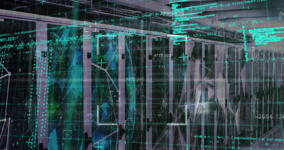 This scene showcases an animated interface of data processing code overlaying a modern server room. It reflects themes of advanced technology and computing, highlighting the dynamic nature of data handling and cybersecurity. This visual can easily be utilized in illustrating information technology concepts, tech-focused presentations, or training materials related to data management and security infrastructure.