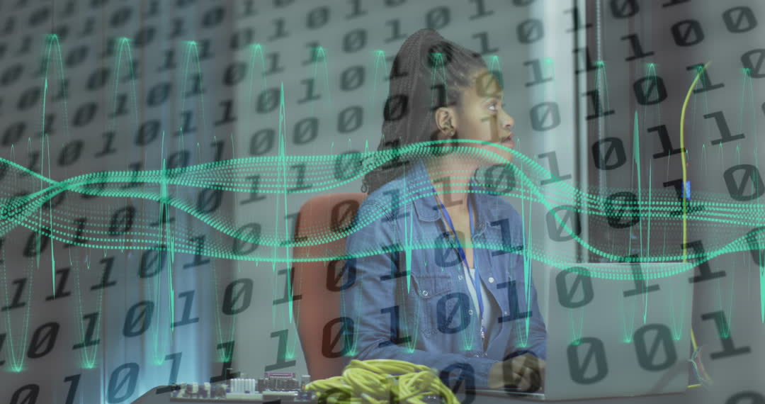 Overlay showcasing african american female technician in server room, surrounded by binary code animation and wave form data. Perfect for illustrations on cloud computing, IT industry content, technology advancements, and cybersecurity visuals.