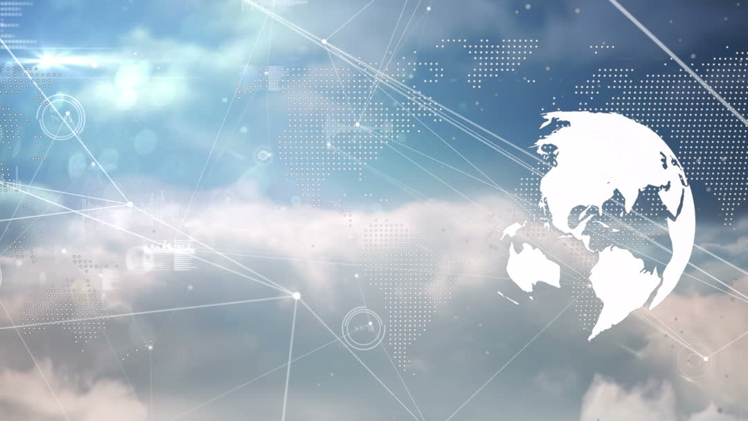 A visually striking representation of data processing overlaid on a world map. Lines and nodal points signify connections in a global business network. Soft cloud videory suggests themes of cloud computing and digital innovation. Ideal for use in presentations about technology, global advancements, finance analytics, and digital networking solutions.