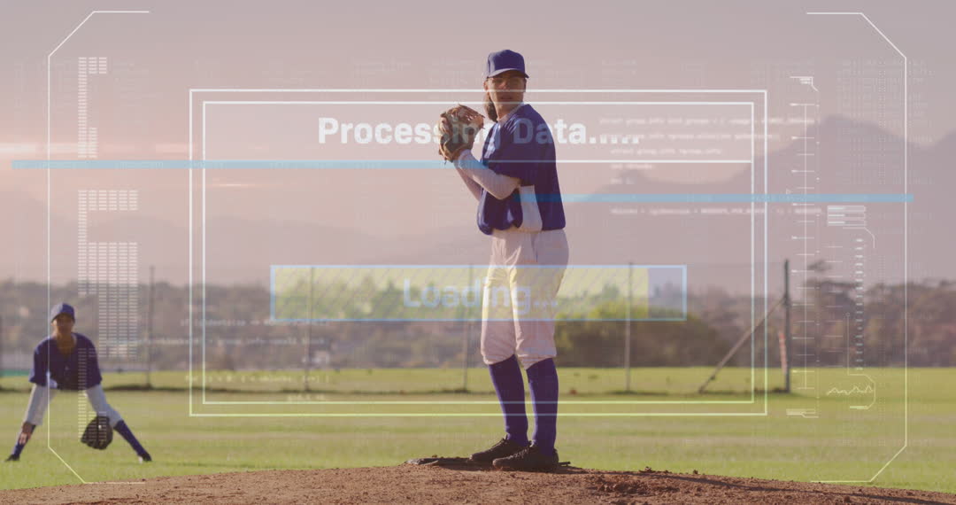 This visual shows a baseball player positioned on a field with a dynamic digital overlay suggesting data processing and loading. The use of technology to enhance sports performance is emphasized, depicting modern innovation in analyzing athletic skills and game strategies. Ideal for articles or presentations on sports analytics, tech-infused sports experiences, or the future of sports.