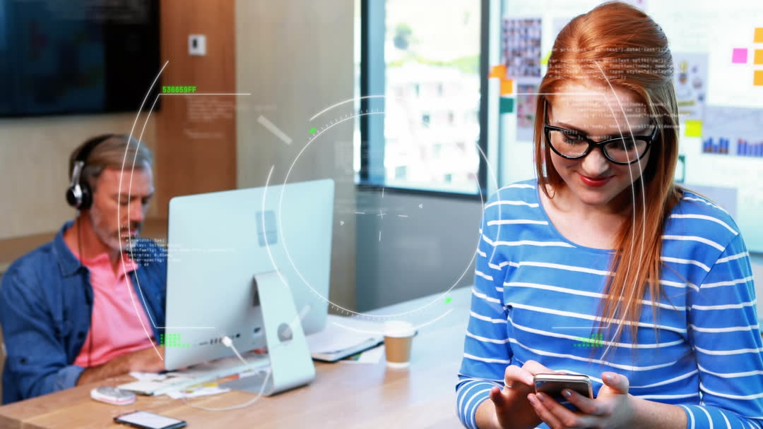 A modern office scene depicting employees engaged in work related to financial data processing. A red-haired woman stands using a smartphone, while a male colleague with headphones works on a computer at his desk. Digital overlay screens with data enhance the tech-focused theme. Useful for illustrating contemporary business, technology integration in educational resources, and advertisements for tech-based office solutions.