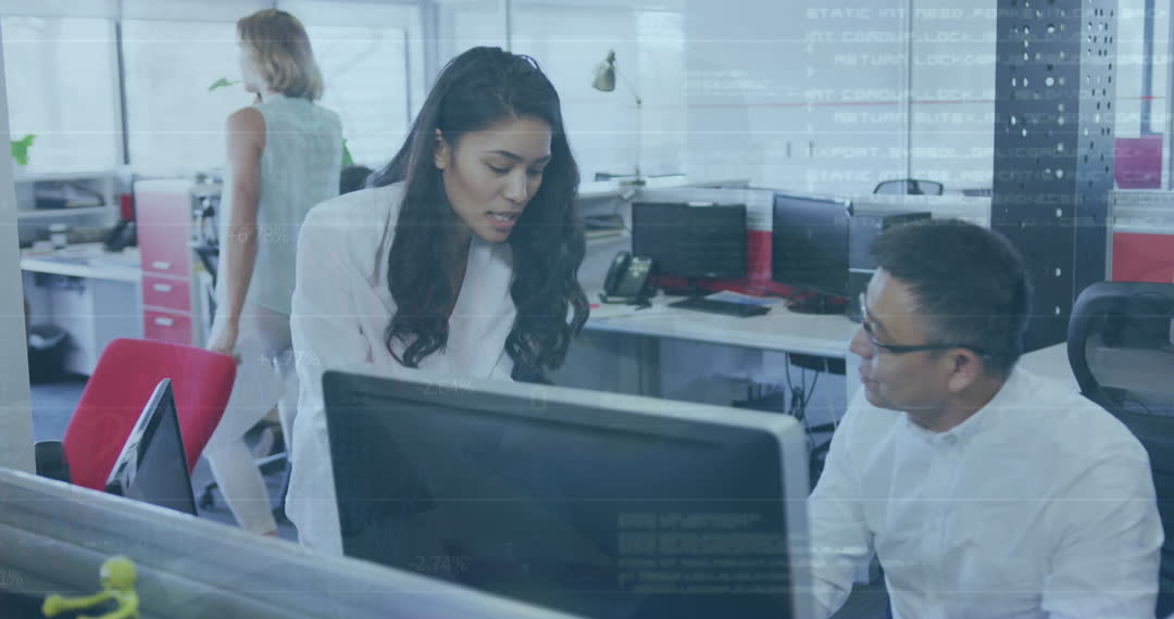 Diverse business team collaborating in a modern office environment, engaging in data processing tasks. Overlaid digital interface videory suggests a high-tech and connected workspace. Useful for illustrating themes of teamwork, modern business, and digital economy within corporate contexts.