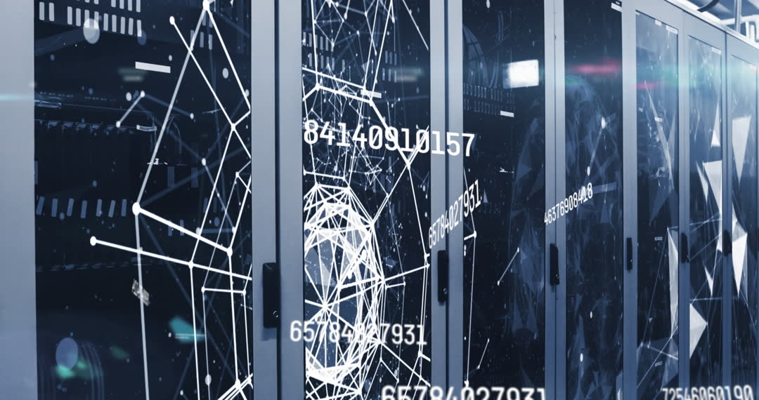 Stylized visualization of network data and digital processing concepts overlayed on computer server racks. Useful for illustrating themes related to machine learning, data centers, and information technology.