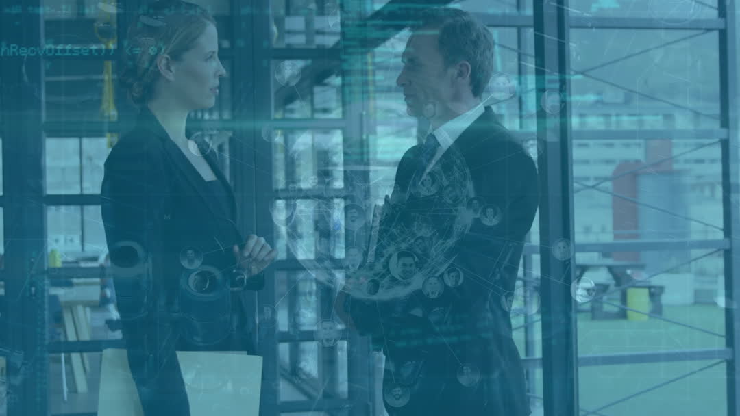 A man and a woman, both dressed in business attire, engage in conversation within an office space. Overlaid digital data graphics suggest themes of technology and global connectivity, indicating a focus on innovation. This video is ideal for advertisements and articles related to modern business practices, technological advancements, and global communication solutions in professional settings.