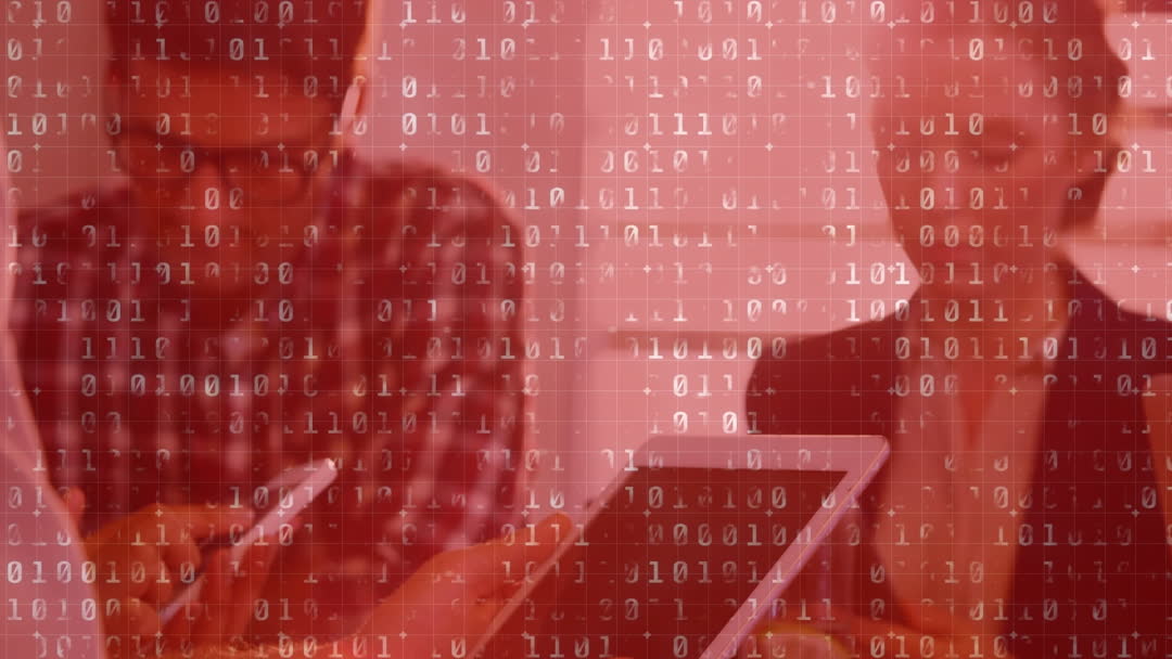 Image features business professionals interconnected with digital data represented by binary code overlay. Suitable for depicting technology-driven environments, showcasing modern workplace innovation, or highlighting teamwork and digital connectivity in corporate settings.